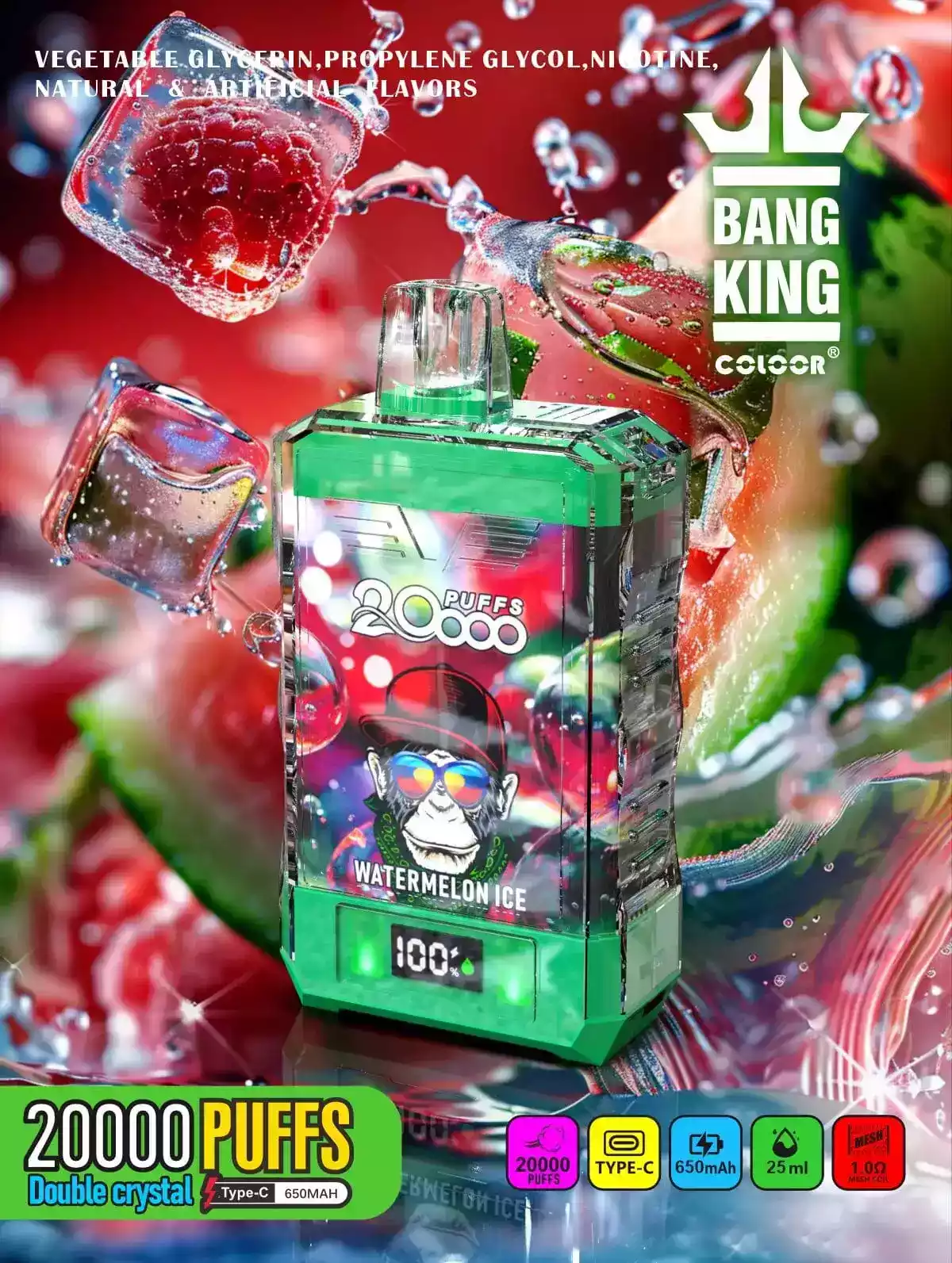 Bang King 20000 Puffs – Einweg E-Zigarette mit 25ml Liquid, 650mAh Akku & Mesh Coil. Bis zu 20.000 Züge, 0–5% Nikotin, 12 Geschmacksrichtungen. Intensiver Genuss bei topvape.store.