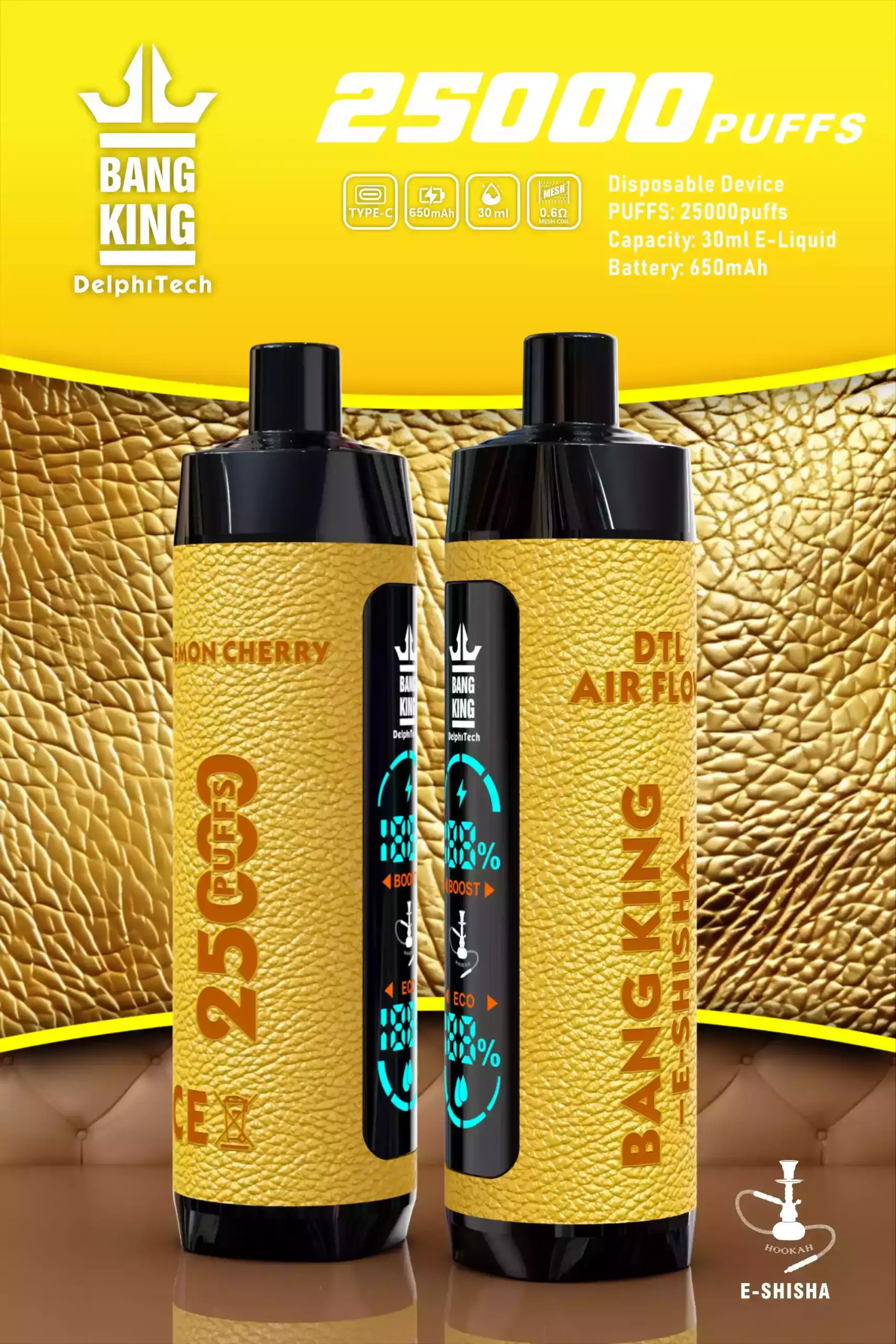Schon beim ersten Zug überzeugt die Bang King 25000 Leather Case durch eine intensive Aromaausgabe und eine weiche, konstante Dampfentwicklung. Die Mesh Coil bringt die Fruchtigkeit der Beeren, die Frische der Minze oder die Süße von exotischen Früchten besonders klar zur Geltung.