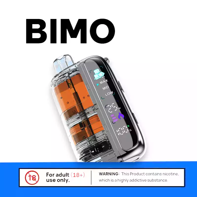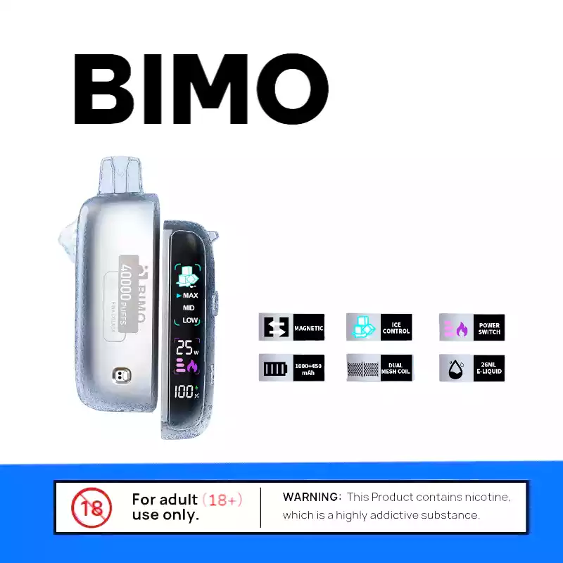 Die BIMO 40K ist eine hochentwickelte Einweg-Vape mit einem austauschbaren Pod-System, zwei getrennten Akkueinheiten (1.000 mAh + 450 mAh), einer Gesamtkapazität von 26 ml E-Liquid sowie einer leistungsstarken 1.1 Ω Mesh Coil.
